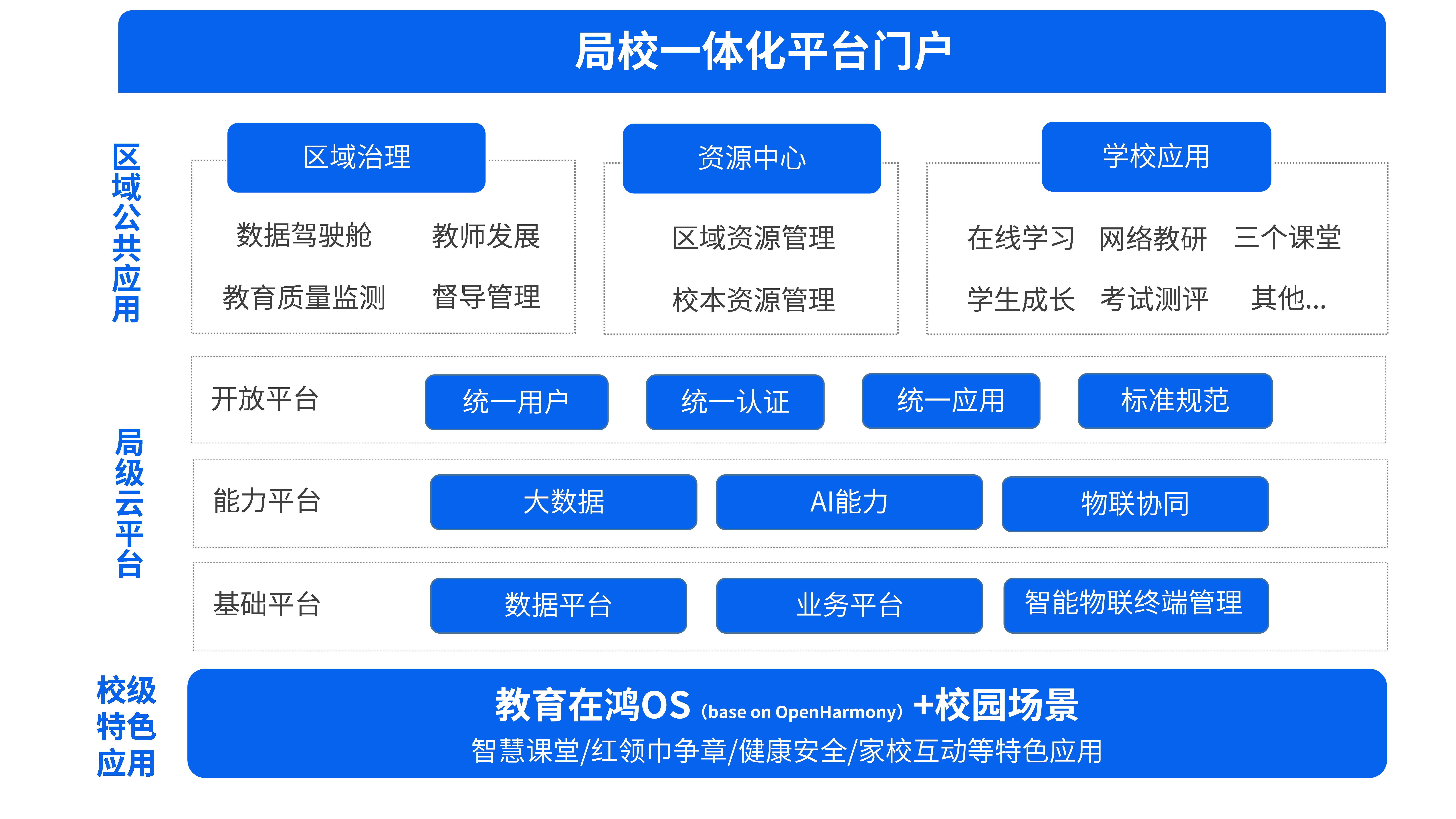 依托云计算、大数据、人工智能等技术,建立市/县(区)局级教育云平台,支持局校一体化使用,统一规划,统一建设,统一运营。